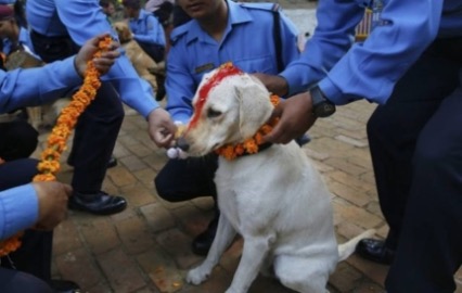 ヒンドゥー教では犬は死の神ヤマの使いとされ、来世で人を助けてくれると信じられています。そこでこの日には、飼い犬、野良犬を問わず、警察犬なども含めてすべての犬がマリーゴールドの花輪を首にかけ、額にはティカという赤い印を付け、特別なごちそうを振る舞われます。